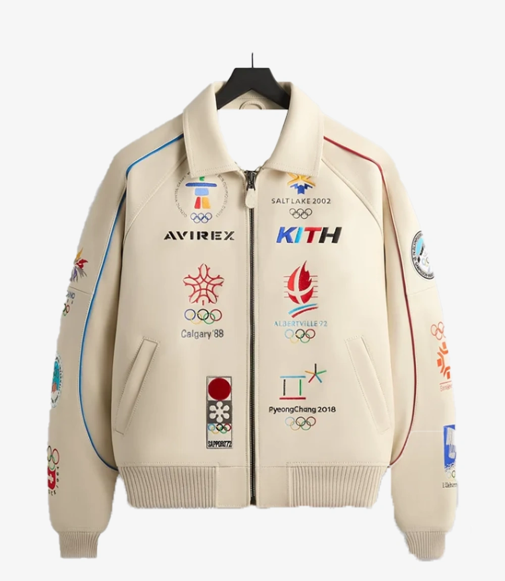 Designed as part of the Olympics Heritage collection, the jacket showcases detailed tri-branding from Kith, AVIREX, and the Olympic Games across the chest and back. It is highlighted by an array of embroidered patches representing historic Winter Olympic events, adding a bold, collectible aesthetic inspired by global sporting heritage.