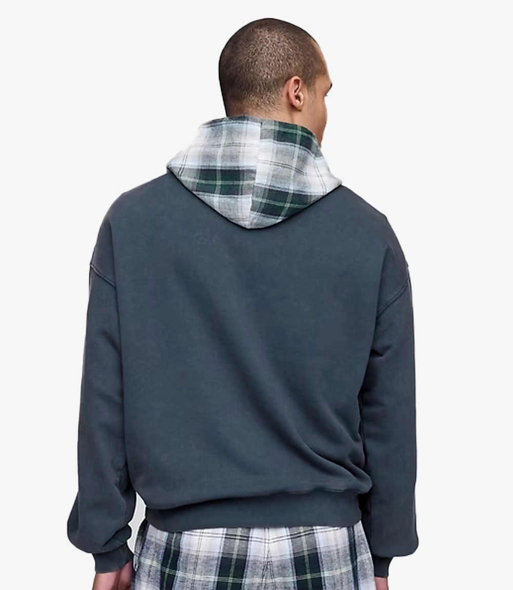 The deep charcoal tone sets a versatile foundation, while the standout detail lies in the contrast plaid-lined hood, adding a subtle nod to classic country club aesthetics. Across the chest, the reimagined arch logo features textured detailing with Malbon-inspired design elements, blending sport and street effortlessly.