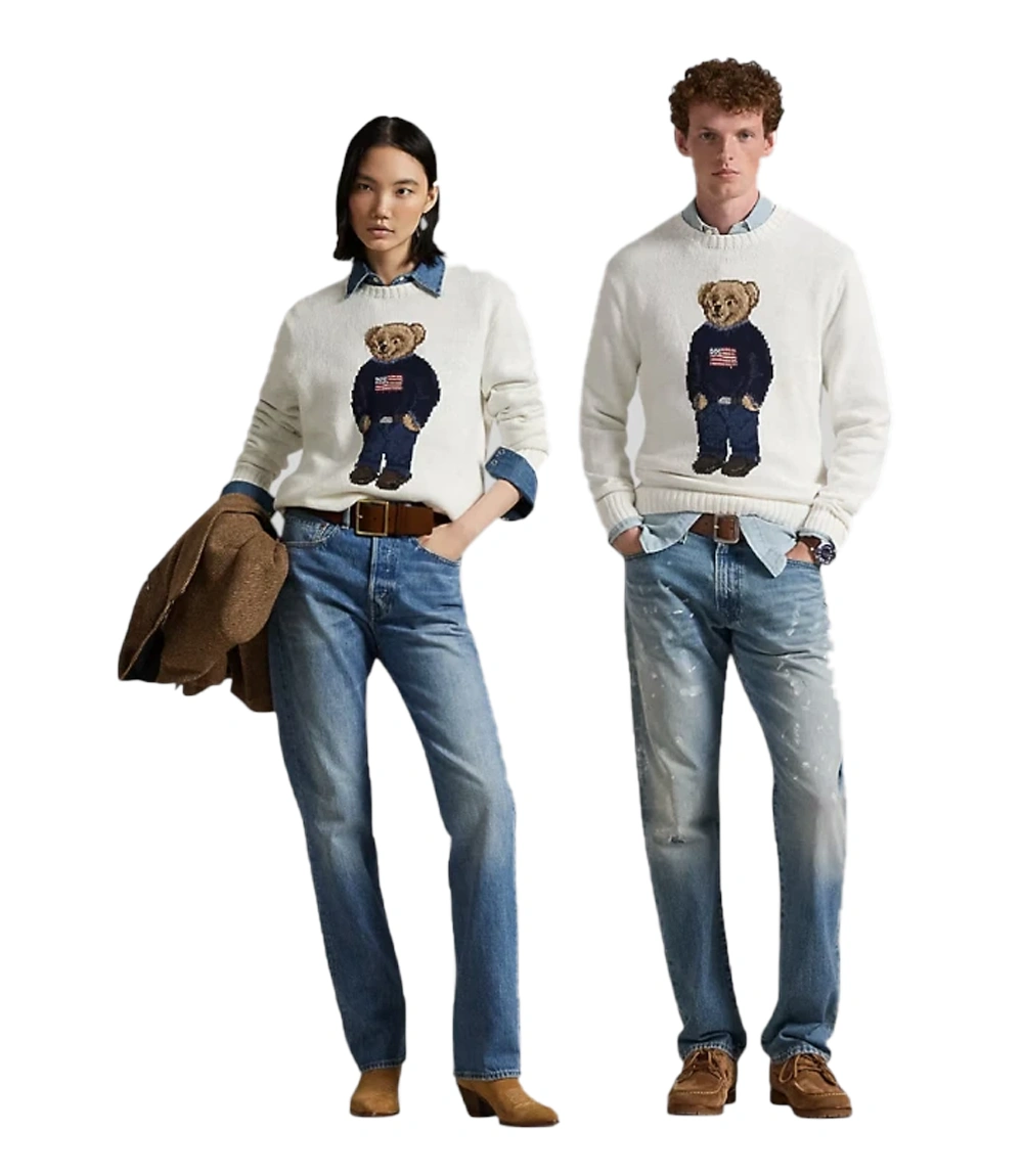 At the center is the iconic Polo Bear, intricately intarsia-knit into the fabric (not printed), showcasing detailed texture and craftsmanship. The bear is dressed in Ralph Lauren’s signature look—typically featuring jeans, loafers, and an American flag sweater—reflecting the brand’s heritage style.