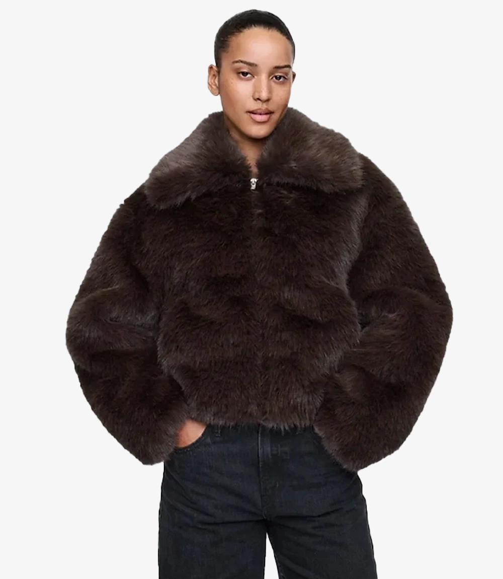 Crafted from ultra-soft faux fur, the jacket features a rich, deep brown tone that adds warmth and depth to any look. The cropped silhouette gives it a modern edge, while the full-zip front allows for versatile styling—wear it open for a relaxed vibe or zipped up for a polished finish.